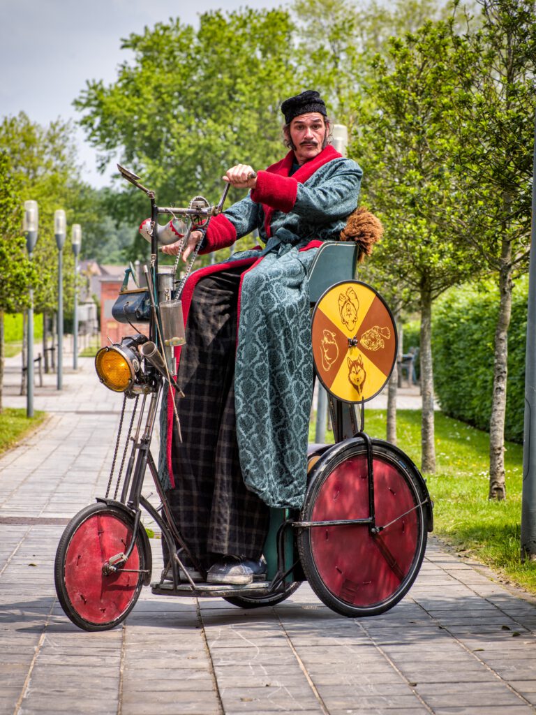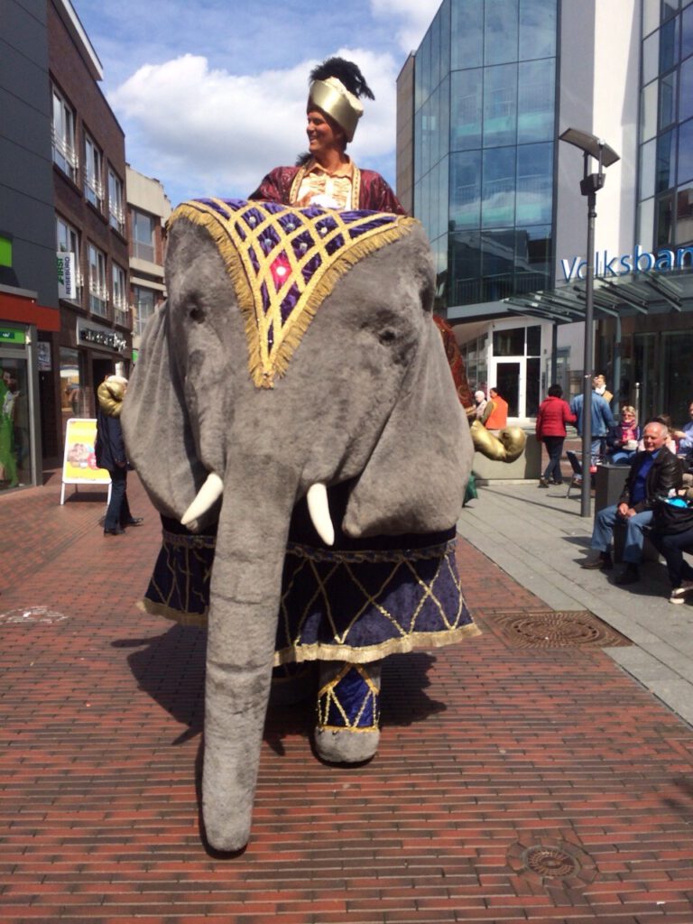 Niets is te gek tijdens Verrassend Doesburg. Hopelijk past deze olifant met zijn kleurrijke chauffeur door de straten van Doesburg.